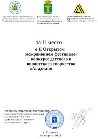 Грамота за II место во II Открытом межрайонном фестивале конкурсе детского и юношеского творчества «Академия искусств»