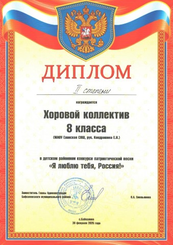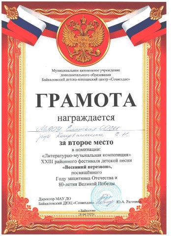 Грамота за II место в номинации "Литературно-музыкальная композиция" XXIII районного фестиваля детской песни "Весенний перезвон", посвященного Году защитника Отечества и 80-летия Великой Победы