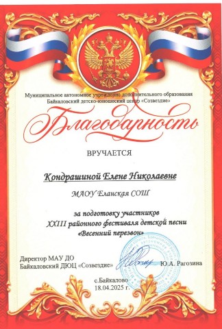 Благодарность Кондрашиной Е.Н. за подготовку участников XXIII районного фестиваля детской песни "Весенний перезвон", посвященного Году защитника Отечества и 80-летия Великой Победы